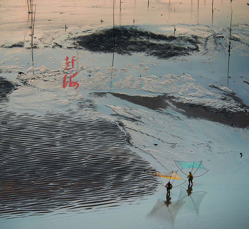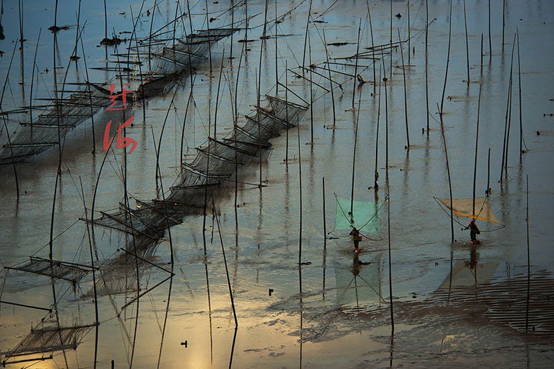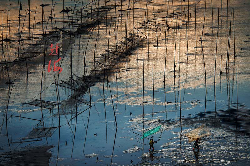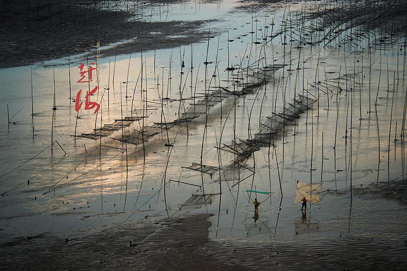 对赶海情景向往已久的我们,专程驾车去到霞浦,却在绵延的阴雨中度过漫长而无奈的三天。计划中的返程时间已到,却又不甘心颗粒无收。查看天气预报,得知将雨转多云,估计次日清晨会有日出,便推迟一天,在离拍摄点最近的渔民家中安顿下来。次日凌晨四点天没亮起床,赶往拍摄点抢占有利地形,定好机位,架好相机,哈欠连天、睡眼惺忪地等待天亮。不一会儿,滩涂沿线已是人声鼎沸,摩肩接踵。后来,听着响成一片的快门声,我心中暗想,这些起早贪黑的摄影者,当然也包括我,又何尝不是在赶海呢?一样的在享用着大自然不菲的馈赠!